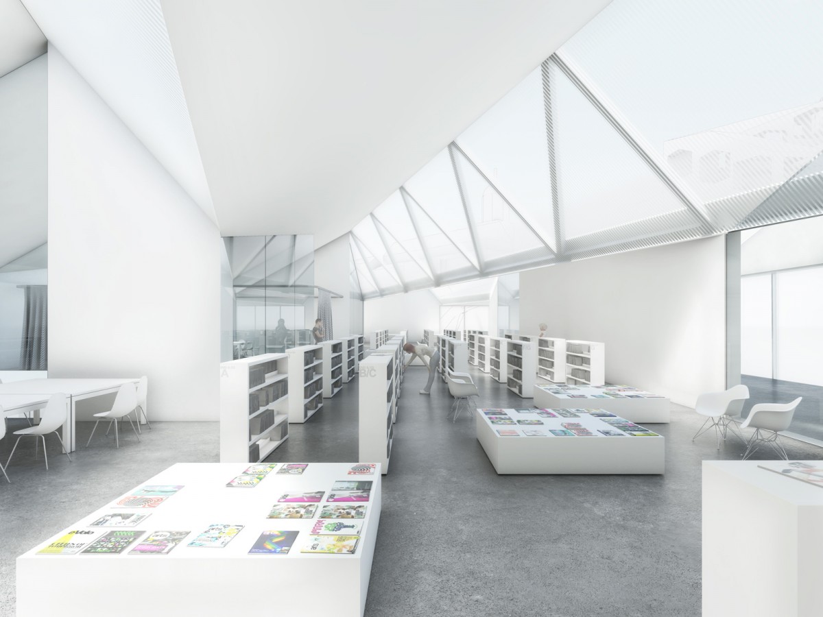 Not only are they spatially intertwined but the arising interfaces give rise to an added value for both utilizations with the mediothek benefitting perhaps most. Because of the envisaged substantial stream of visitors and due to logistic reasons all functions of the cafeteria are located on the ground floor. For the mediothek to function properly it is important to create a quiet atmosphere. A natural but indirect and diffuse illumination is of enormous importance for handling the media provided there. This type of illumination is best realized through the roof of the upper floor. The visual presence of the mediothek in the cafeteria is above all to draw the attention of the students during lunch to the knowledge stored in various media thereby stimulating their interest in joint studies and combining both domains.