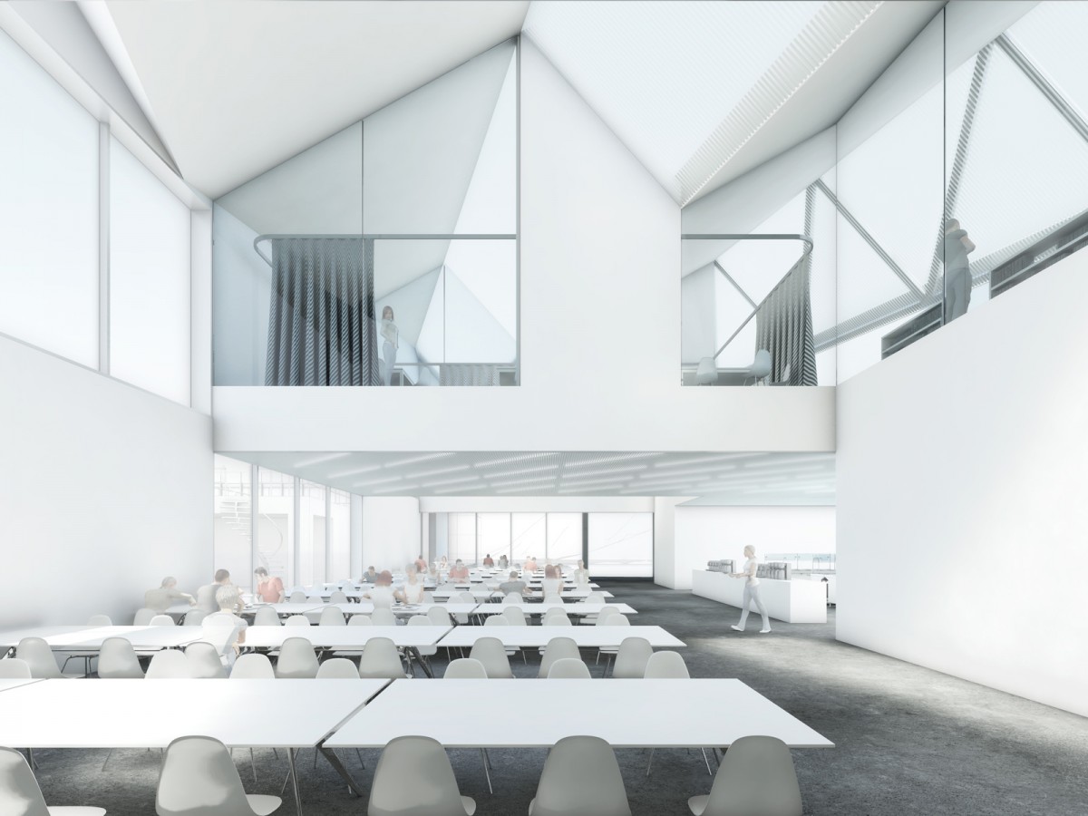 The two large air spaces above the guest areas of the cafeteria not only serve to improve the ambience by means of a natural illumination and ventilation but they form also the central organisational element of this design. They open generous view relationships between the working students and the guests in the cafeteria. They also articulate the upper floor without visually de-coupling the diverse areas of the mediothek advocating communicating within the whole building. The outer garment of the building resulting from these design elements and the conditions of the lot is described mainly by two parameters. On one hand, the perimeter of the ground floor is indented inward near bottlenecks in order to offer more space for the streams of students to and from the sports facilities „Sand“. This gives rise to a polygonal floor plan within the circumscribed rectangle of the projected upper flight. On the other hand, the shed roof directed towards north warrants a glare-free natural indirect illumination.