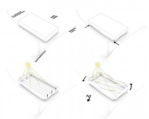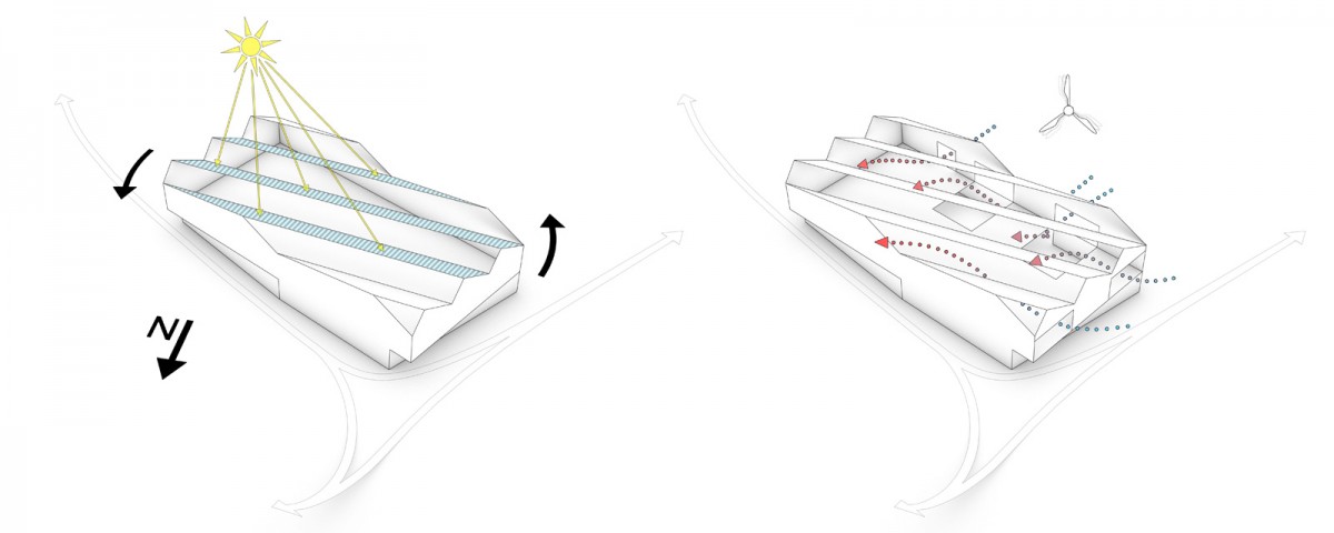 The building authority of the canton Graubünden set up a competition for an extension of the local school complex in Chur, including a new media centre („Mediothek“), a cafeteria and an additional building for new lecture halls. In order to comply with the given space allocation plan this design allots two separate parts of the envisaged structure.