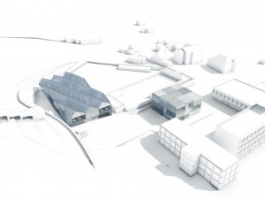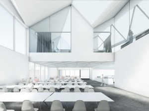 All functions of the cafeteria and „Mediothek“ are combined in a single building which is located directly at the assemblage point between the already existing lecture facilities (Cleric & Bio Cleric), the sports facilities Badi Sand, and the planned new connection with the institutions sitting (among others Kanti Halde). The second building hosts the new lecture halls and complements the presently existing ensemble consisting of the Cleric and Bio-Cleric enhancing the schoolyard’s fourth spatial edge. The basic idea for the cafeteria-mediathek complex is to carve out a synergetic effect between the two functions.