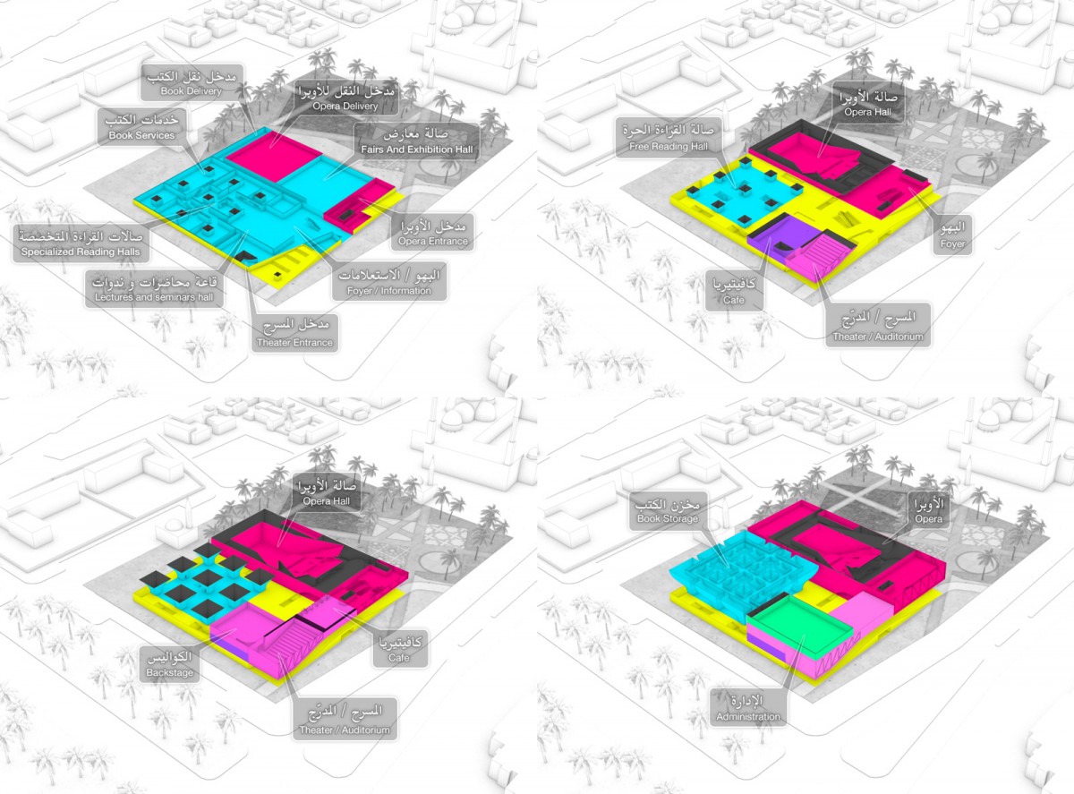 The volume of each of the three main functions, opera, theatre, and library, is optimally tailored to the specific demands of the respective utilisation and clearly visible from the outside. The position of each function within the context depends on its interfaces with the other functions in the building as well as on the interfaces with the surrounding city and the visual contact with its important historic sites. Accordingly, all important transparent parts of the outer shell, as for instance, the background of the stage of the theatre and parts of the facade of the large reading hall, refer to the nearby world-famous citadel of Aleppo. This several thousand years old landmark therefore serves as the main cultural scenery for the new centre.