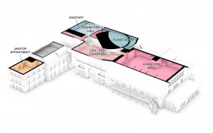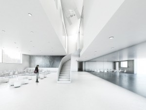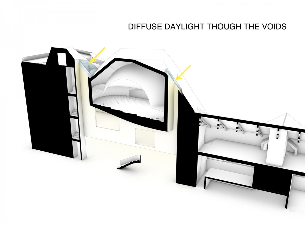 The exterior of the roof and wall will be lined with the same material, with large panels of zinc butted together, simplifying the sculptural design of the new build and giving it a muted effect. The same principle will be applied to the design of the interior. The floor and walls will be kept white in order to give free rein to the interplay between the shapes and the light, without seeking to make a spectacle of this. This creates indoor spaces whose atmosphere makes them perfectly suited to exhibitions. Optimal use of daylight will be achieved through the use of large window openings in the facade and carefully positioned windows in the roof. The natural light will be distributed throughout the entire building through the openings to the air space inside the new build.