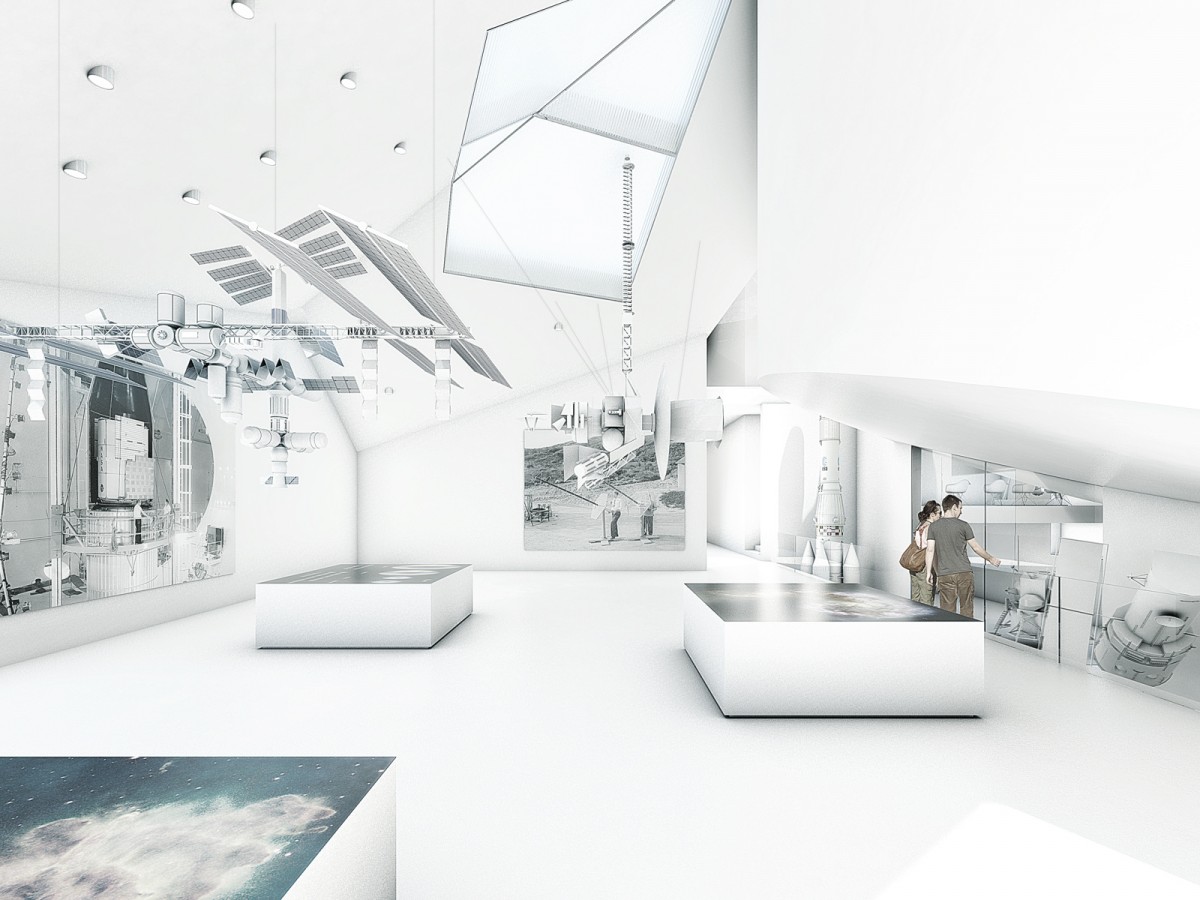 Creating a place which is devoted to showing and sharing science also means making a cultural contribution in the widest sense in a society which is characterised like no other by science and by the desire to understand our world and where we come from. A design that invites visitors to find out about and actively experience themes and correlations that exist within nature, research of space and nature poses a particular challenge. For this very reason, a task of this nature demands due respect. Logic and consequence on the one hand, respect for the culture and history of the place on the other hand play a major part in this correlation. Therefore, one of the primary objectives of this design is to identify and highlight possible synergies between the individual functional areas. The public section of the space programme can be split into two distinct function groups, the planetarium (with its solar observatory and viewing platform) and a large exhibition area (with space for presentations and workshops). The possible links between them are of interest.