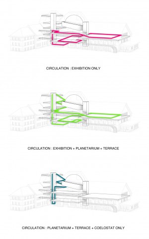 Various scenarios are conceivable. Good circulation through the building can enrich the visit to the planetarium by opening up the exhibition, generating added value. On the other hand, a visit to one of the exhibitions can culminate in a visit to the viewing platform because both sections of the development terminate at the same point. However, in addition to this combination of circulation and functional connections, the specific character of the place also plays a major role. It is important to incorporate the new build into the established structure and to preserve the latter‘s identity without becoming hidden or even being untrue to itself. The new build may be identifiable as a new element within this ensemble, showing respect to the history of the buildings directly beside it.