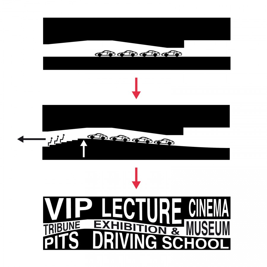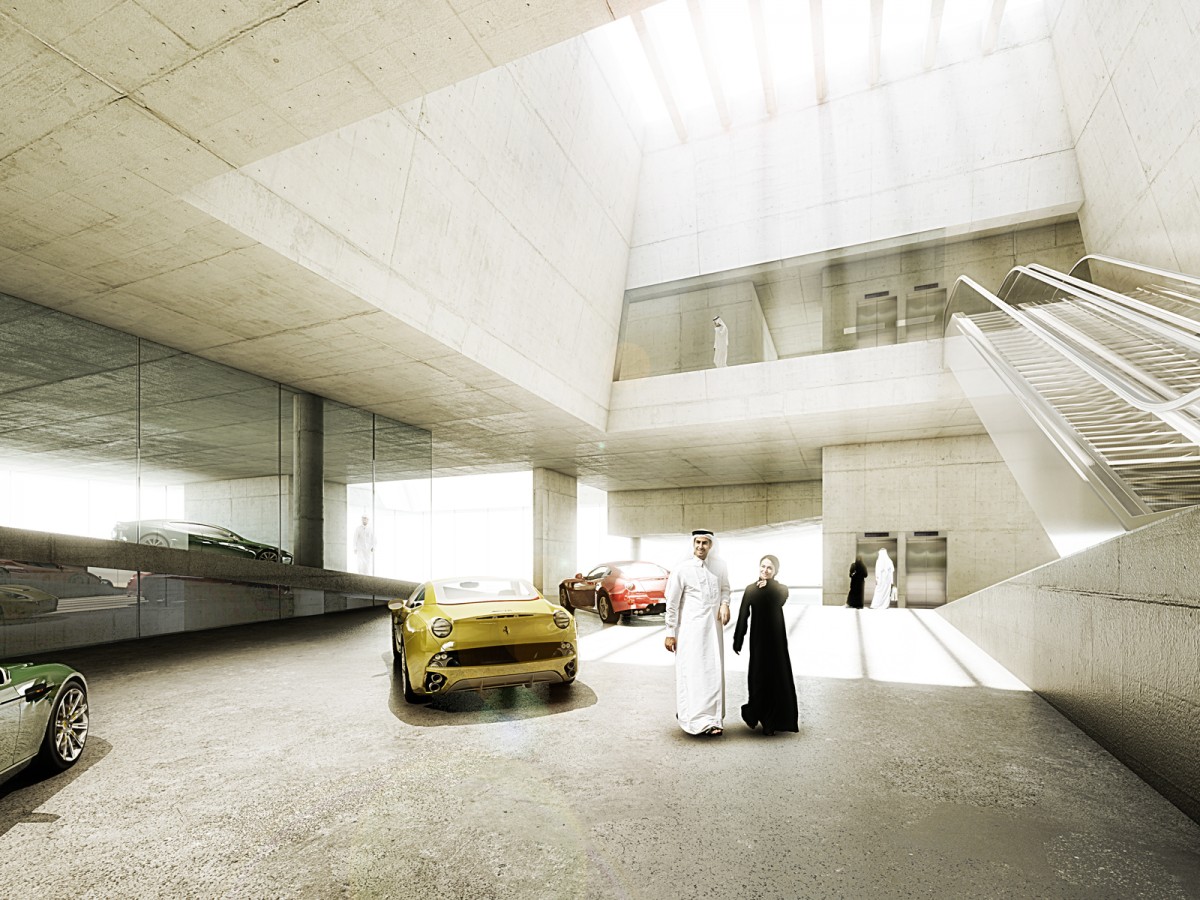 The volume is split into three main parts which are stacked on top of each other. The public layer in the middle - in between all the car-related facilities on the ground floor and the conference spaces and VIP area on the top floor - acts as kind of an open transparent gap, presenting all the King‘s cars. A concrete landscape transforms from the exhibition space on the one side to a concentric tribune on the other side – allowing view connections to the upper and lower levels. A big ramp leads up to the main exhibition floor, serving as a drop off zone for the King‘s special guests, covering the main entrance on the ground floor.