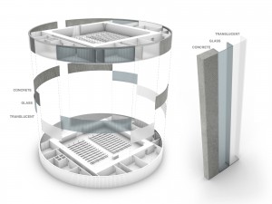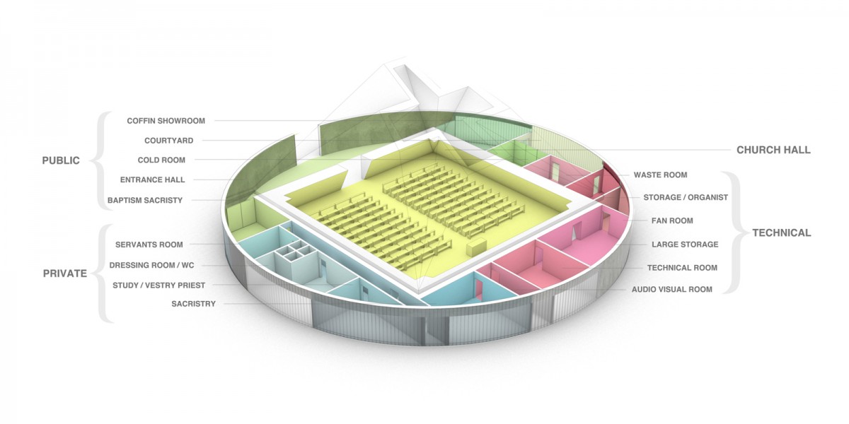 It also provides the framework for all secondary functions, divided thematically into three distinct groups: the public spaces, private rooms for the pastor and his acolytes and all storage / technical rooms. The shape of the circle is underscored by the realization of a ring of equal sized elements. Depending on the internal use and its contact with the outside space, the elements consist of precast concrete, U-shaped glass or U-shaped translucent glass.