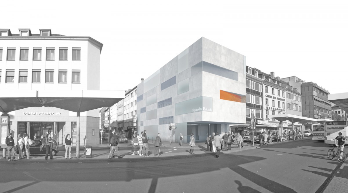In 2006 the German “Sparda Bank” decided to announce an architectural competition for their new branch office in Bonn. The old degenerated building at the corner of a prominent spot in the middle of the city should be replaced by a new and modern building.