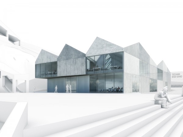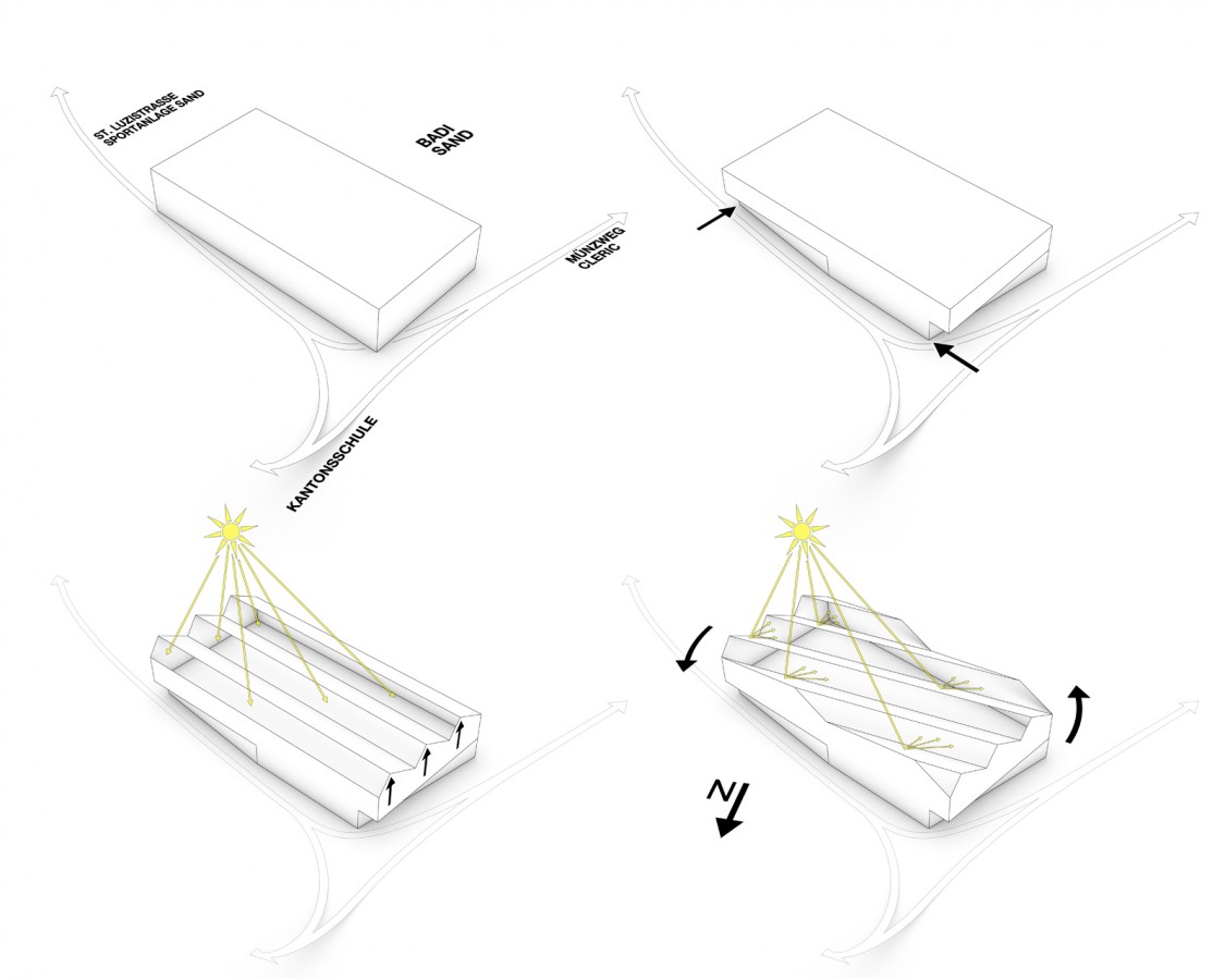 All functions of the cafeteria and „Mediothek“ are combined in a single building which is located directly at the assemblage point between the already existing lecture facilities (Cleric & Bio Cleric), the sports facilities Badi Sand, and the planned new connection with the institutions sitting (among others Kanti Halde). The second building hosts the new lecture halls and complements the presently existing ensemble consisting of the Cleric and Bio-Cleric enhancing the schoolyard’s fourth spatial edge. The basic idea for the cafeteria-mediathek complex is to carve out a synergetic effect between the two functions.