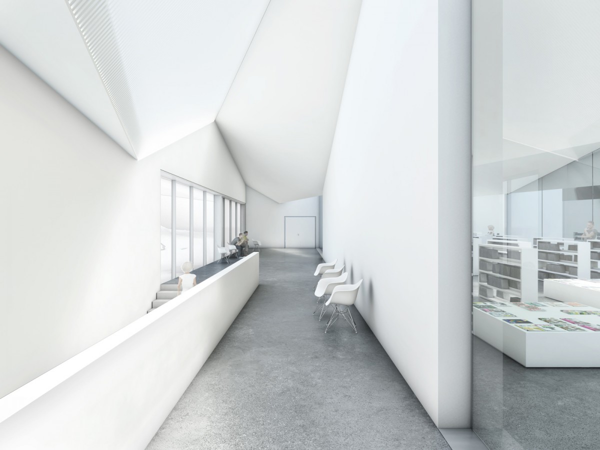 Not only are they spatially intertwined but the arising interfaces give rise to an added value for both utilizations with the mediothek benefitting perhaps most. Because of the envisaged substantial stream of visitors and due to logistic reasons all functions of the cafeteria are located on the ground floor. For the mediothek to function properly it is important to create a quiet atmosphere. A natural but indirect and diffuse illumination is of enormous importance for handling the media provided there. This type of illumination is best realized through the roof of the upper floor. The visual presence of the mediothek in the cafeteria is above all to draw the attention of the students during lunch to the knowledge stored in various media thereby stimulating their interest in joint studies and combining both domains.