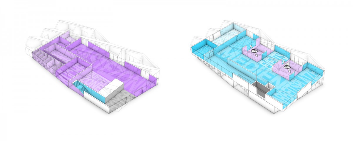 The building authority of the canton Graubünden set up a competition for an extension of the local school complex in Chur, including a new media centre („Mediothek“), a cafeteria and an additional building for new lecture halls. In order to comply with the given space allocation plan this design allots two separate parts of the envisaged structure.