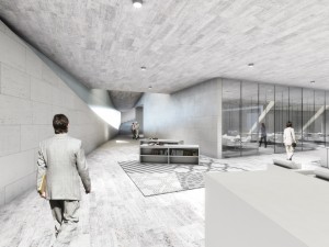 Aside from these distinctive sculptural constituents of the design one identifies two further shaping elements. On the one hand, the architrave block hosts the main entrance for the pedestrian traffic and all back of house functions. On the other hand, all main functions from the first floor upwards surround an interior yard that can be accessed from the outside by foot and by car via an extended ramp. The yard forms the visual link between all functionality and enables accessing them from one central point.