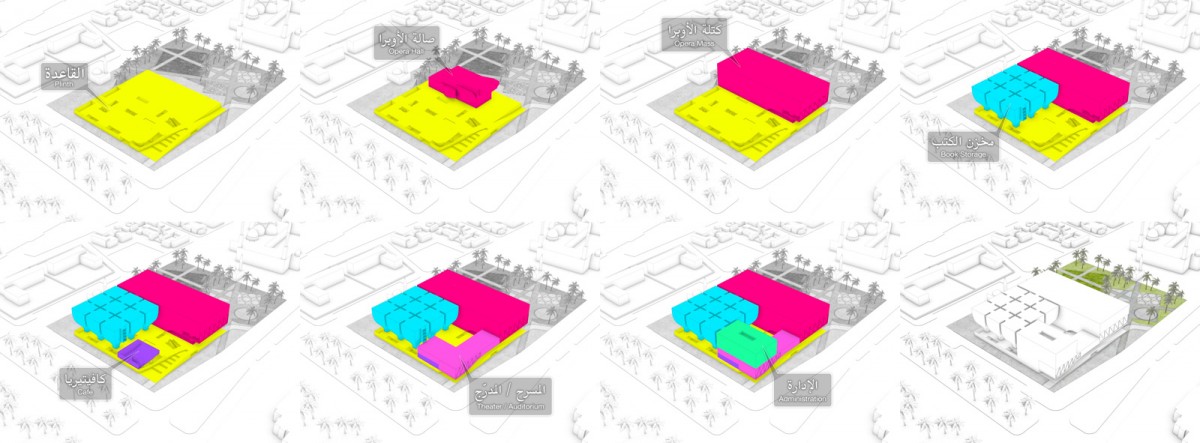 The volume of each of the three main functions, opera, theatre, and library, is optimally tailored to the specific demands of the respective utilisation and clearly visible from the outside. The position of each function within the context depends on its interfaces with the other functions in the building as well as on the interfaces with the surrounding city and the visual contact with its important historic sites. Accordingly, all important transparent parts of the outer shell, as for instance, the background of the stage of the theatre and parts of the facade of the large reading hall, refer to the nearby world-famous citadel of Aleppo. This several thousand years old landmark therefore serves as the main cultural scenery for the new centre.