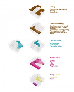 Ascending a spiraling ramp - a helix - corresponds to radially leaving the downtown area. The higher I move up the farther I get from the center of town. At the bottom of the ramp - the interface to downtown - one can make use of urban functions represented by a discounter like Aldi or a cafe. Moving up - away from downtown - one finds a sports center typically located in more peripheral city areas. Further up follow office complexes. Finally, the outer circle of this „mini-town“ at the upper end of the ramp is formed by housing units offering all the advantages of suburban living culture.