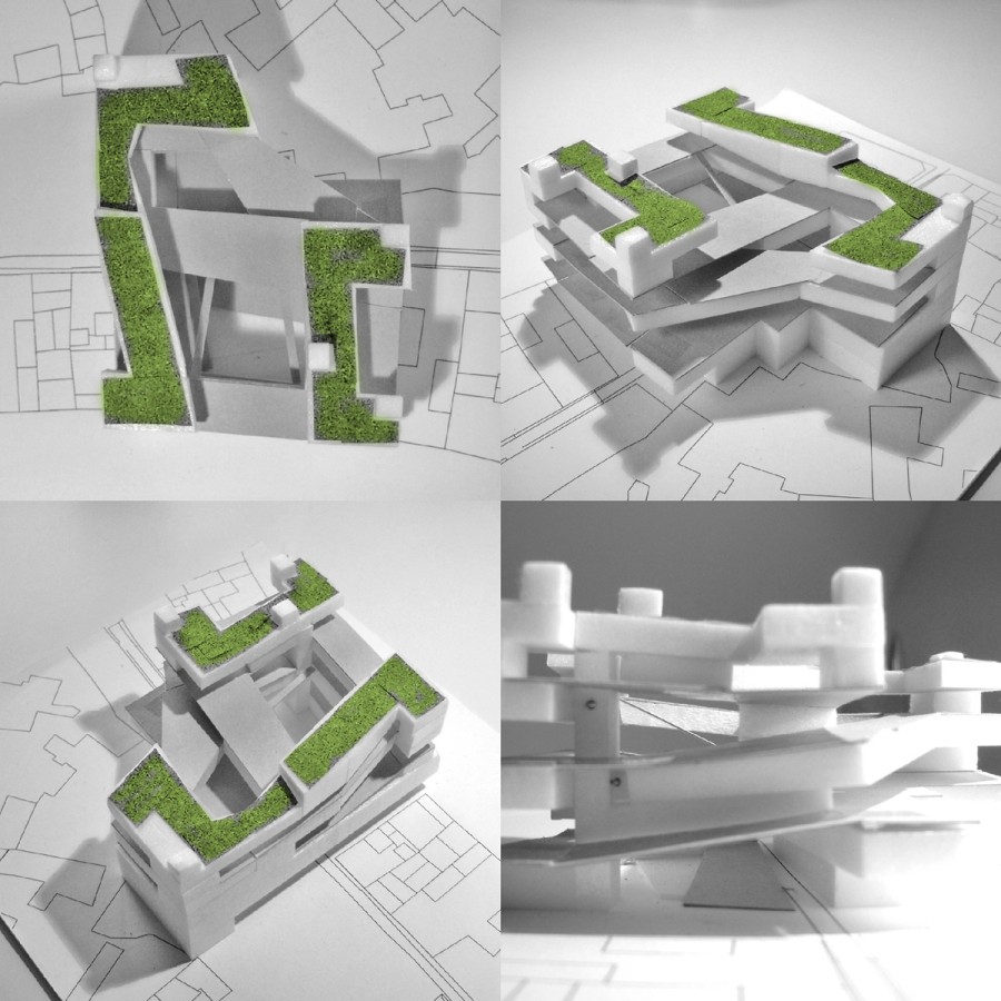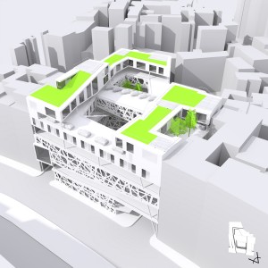 The objective is to develop a building complex realizing a spacial condensation of several functions in an urban environment. It should go well beyond a mere agglomoration of several diverse types of using but - as a result of synergetic mutual exchange processes - should give rise to a true spacial and functional „added value“.