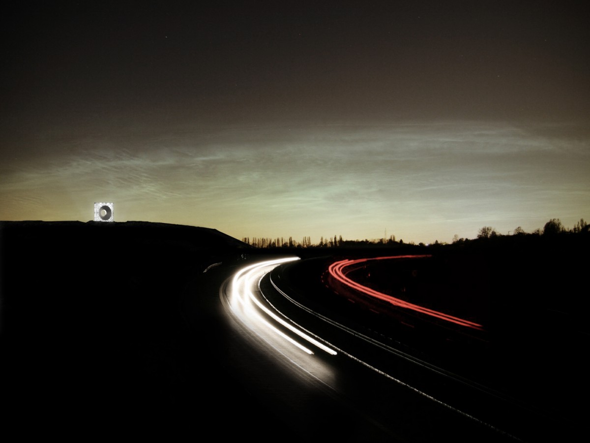 During the night the interior skeleton of the landmark is illuminated by fluorescent tubes. The structure of the polycarbonate plates refractors the light in the interior and the whole sculpture emits a uniform illumination.