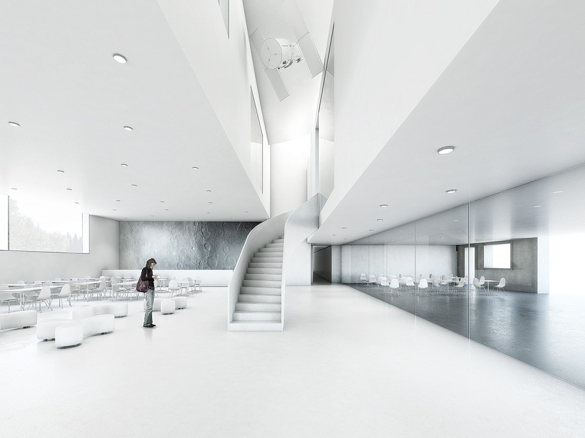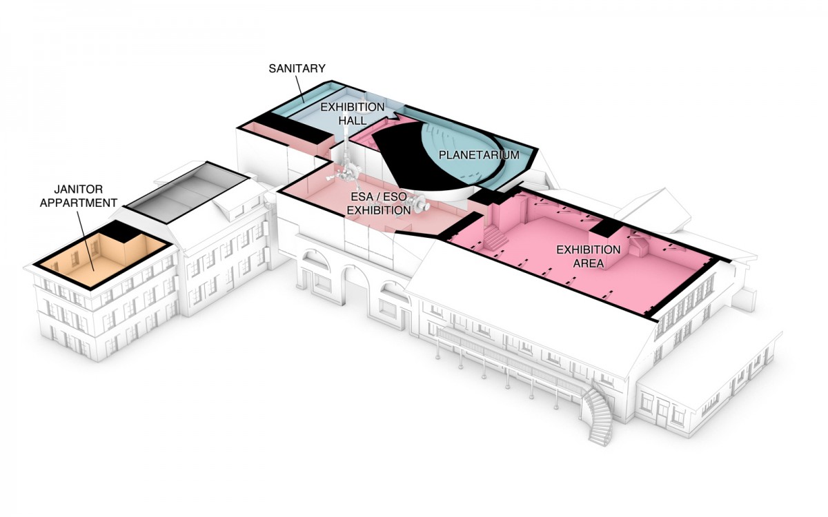 Creating a place which is devoted to showing and sharing science also means making a cultural contribution in the widest sense in a society which is characterised like no other by science and by the desire to understand our world and where we come from. A design that invites visitors to find out about and actively experience themes and correlations that exist within nature, research of space and nature poses a particular challenge. For this very reason, a task of this nature demands due respect. Logic and consequence on the one hand, respect for the culture and history of the place on the other hand play a major part in this correlation. Therefore, one of the primary objectives of this design is to identify and highlight possible synergies between the individual functional areas. The public section of the space programme can be split into two distinct function groups, the planetarium (with its solar observatory and viewing platform) and a large exhibition area (with space for presentations and workshops). The possible links between them are of interest.