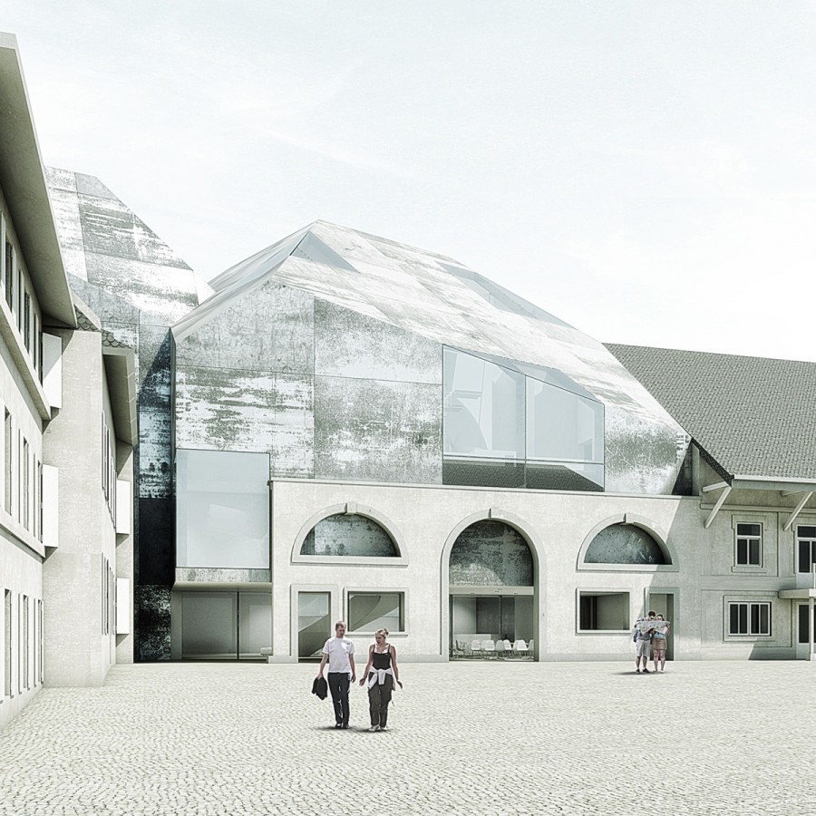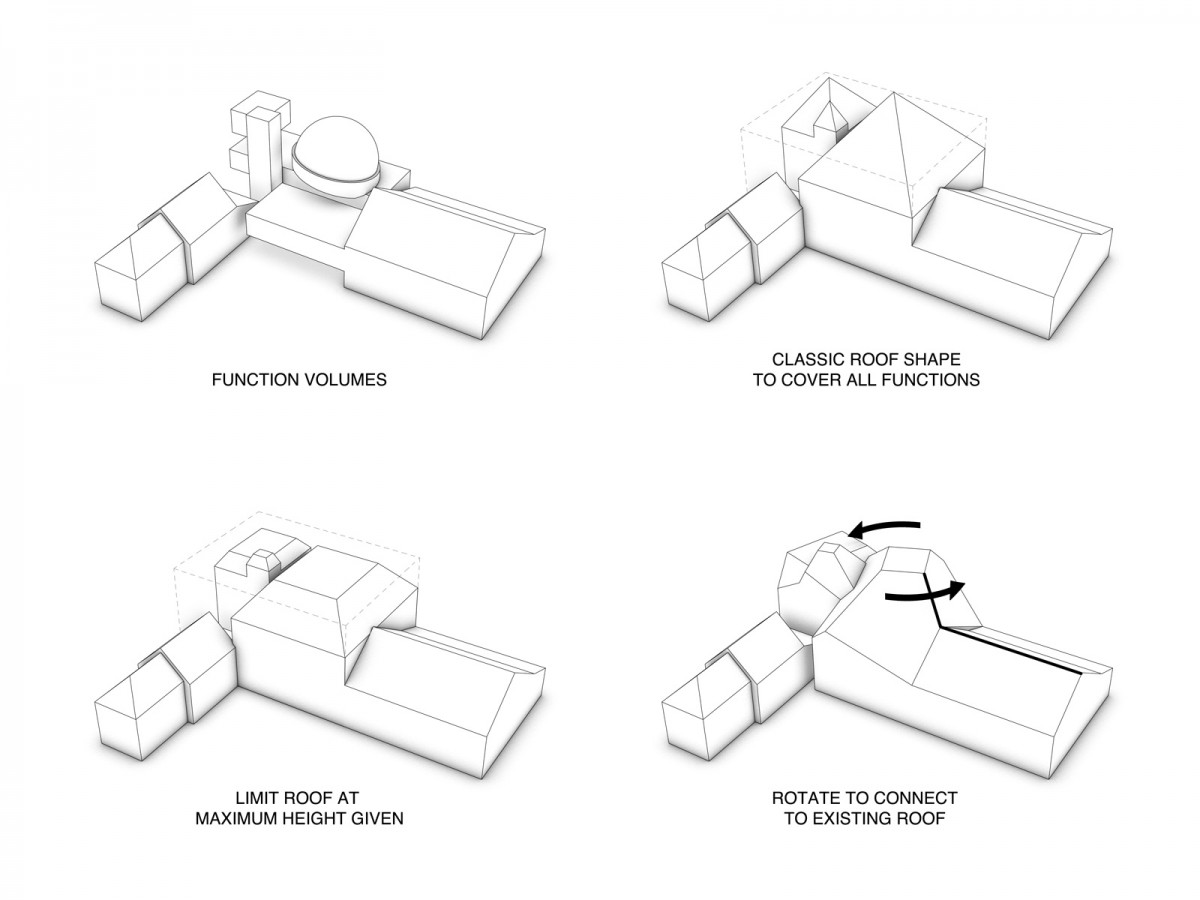 The sculptural design of the new build is developed both from functional elements, as well as by incorporating the geometry of the surrounding building. Therefore, it slots harmoniously into the existing structure and complements it without upsetting the original harmony. It takes its geometry from the edges of the roof of the existing building adjacent to it. By rotating the individual roof volumes, the new build can be connected to the existing neighbouring ridge and, at the same time, an elegant solution to covering the vast spaces and the dome can be found. In order to optimise the sculptural design spatially, all the roof peaks will be capped at the maximum structural height or lower.