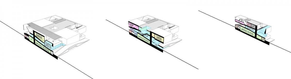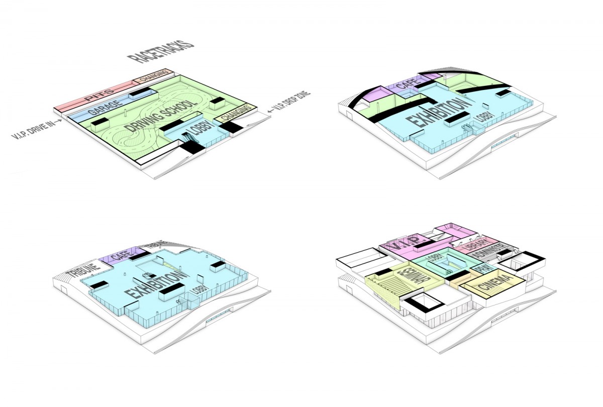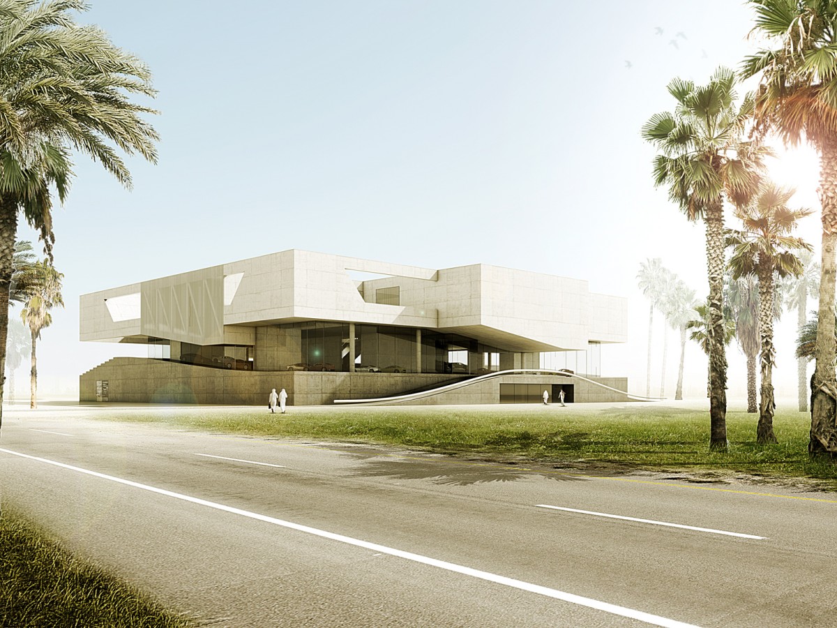 The volume is split into three main parts which are stacked on top of each other. The public layer in the middle - in between all the car-related facilities on the ground floor and the conference spaces and VIP area on the top floor - acts as kind of an open transparent gap, presenting all the King‘s cars. A concrete landscape transforms from the exhibition space on the one side to a concentric tribune on the other side – allowing view connections to the upper and lower levels. A big ramp leads up to the main exhibition floor, serving as a drop off zone for the King‘s special guests, covering the main entrance on the ground floor.