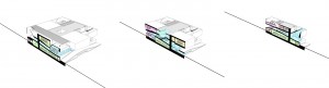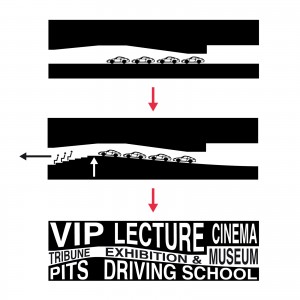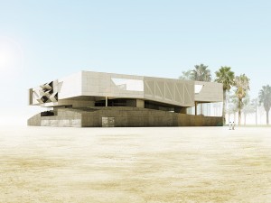 Due to the local climate the major part of the outer facade is closed. The heavy concrete structure provides enough mass to cool down the entire building. Only the „gap“ is totally glazed. A huge set back protects the exhibition space from direct sunlight and provides diffuse natural lighting and a great view over the whole race track.