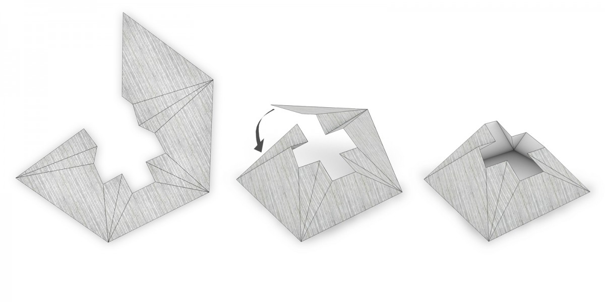 With the square as a projection on the ground, the space transforms its outline to the roof surface which forms a cross. The vertical beam of the cross symbolizes the relationship between God and man. The horizontal beam of the cross links the relationship between people. Its outer walls extended well beyond the ring, are made of narrow wooden elements. They fold like a cape around the sculpture.