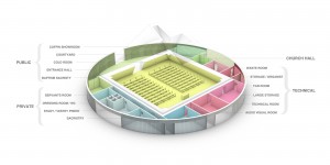 It also provides the framework for all secondary functions, divided thematically into three distinct groups: the public spaces, private rooms for the pastor and his acolytes and all storage / technical rooms. The shape of the circle is underscored by the realization of a ring of equal sized elements. Depending on the internal use and its contact with the outside space, the elements consist of precast concrete, U-shaped glass or U-shaped translucent glass.