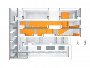 In 2006 the German “Sparda Bank” decided to announce an architectural competition for their new branch office in Bonn. The old degenerated building at the corner of a prominent spot in the middle of the city should be replaced by a new and modern building.
